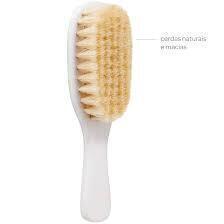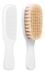 A escova tem cerdas naturais macias e o pente tem as pontinhas arredondadas, ideais para o couro cabeludo do pequeno.
